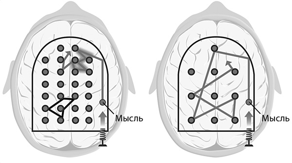 В качестве примера посмотрите на верхнюю «мысль», которую пинбол-автомат поначалу перебрасывает с места на место на левой иллюстрации. Эта мысль очень далека от нижнего участка мыслей и никак с ним не соединена. Обратите внимание: часть «верхнего» участка мысли движется по широким дорожкам – это значит, что нечто подобное вы уже обдумывали. Нижняя часть – новая мысль: под ней нет широких протоптанных путей.