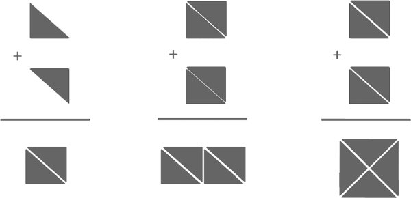 Небольшой пример для иллюстрации разницы между сфокусированным и рассеянным мышлением. У вас есть два треугольника, и их нужно сложить в квадрат – вы легко это сделаете (как показано слева). Если вам дадут еще два треугольника и попросят сложить квадрат, то вы сначала ошибочно попытаетесь сложить их в прямоугольник (как показано в центре). Это потому, что у вас уже сформировались протоптанные пути сфокусированного мышления и теперь вы им следуете. И лишь в результате интуитивного расфокусированного скачка вы осознаете, что треугольники нужно переложить совершенно в другом порядке (как показано справа){21}.