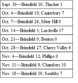 Brimfield had played nine games, of which she had won six, lost two and tied one, not a bad record, as the Review rather complacently pointed out, for a school whose football history dated back but a few years. But Brimfield didn't waste much time contemplating past performances. Had the team won every game in its schedule by an overwhelming score, the season would still be a dismal failure if it lost to Claflin, just as, if it finally won its big game, the school would rise up and call it blessed even had it lost every other contest of the season. In other words, Claflin was the only foe that really counted, and the Claflin game was the final test by which the Brimfield Football Team stood or fell.