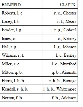 Norton punted on first down and Claflin returned it. Kendall misjudged the ball and it rolled to the Maroon's twelve yards. Milton fell on it there. Kendall and Norton gained two yards each through centre, and Norton punted to Brimfield's forty-five yard line, where Burrage made a fair catch.