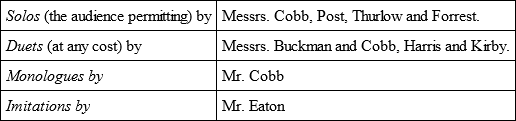 To be followed by the First Appearance in this part of the Country of Professor Carlos Cole, Prince of Prestidigitators, in Astounding Card Tricks, Marvellous Feats of Sleight-of-Hand and Appalling Wonders of White and Black Magic never before seen on any stage and not likely to be again! (The Management earnestly requests Members of the Audience not to loan the Professor either money or hats. The Management will not be Responsible for the Return of such Articles.)