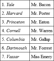 Chub, who came next, represented a Princeton baseball player, striped stockings on his sturdy legs, gray shirt over his black jersey, a gray cap set rakishly over his smiling face and a mask and ball under his arm. The applause seemed to be more a tribute to Chub, the captain of the Ferry Hill Nine, than to the picture he made or the college he represented. After the music of "Old Nassau" had ceased the curtain fell once more. Then followed Warren as a Cornell oarsman, Gallup as a Columbia tennis player and Tom Forrest, with a sixteen-pound hammer behind him, poised for a throw. Forrest wore Dartmouth's colors and made an unmistakable hit.