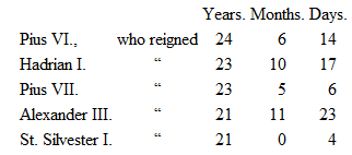 It is also well known that an ancient tradition forbids the hope of any of St. Peter’s successors, pervenire ad annos Petri; i. e., to reign 25 years.