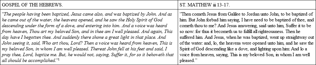The Gospel of St. Matthew gives no explanation of the occasion, the motive, of Jesus coming to Jordan to the baptism of John. It says simply, “Then cometh Jesus from Galilee to Jordan unto John, to be baptized of him.”206 But the Nazarene Gospel is more explicit.