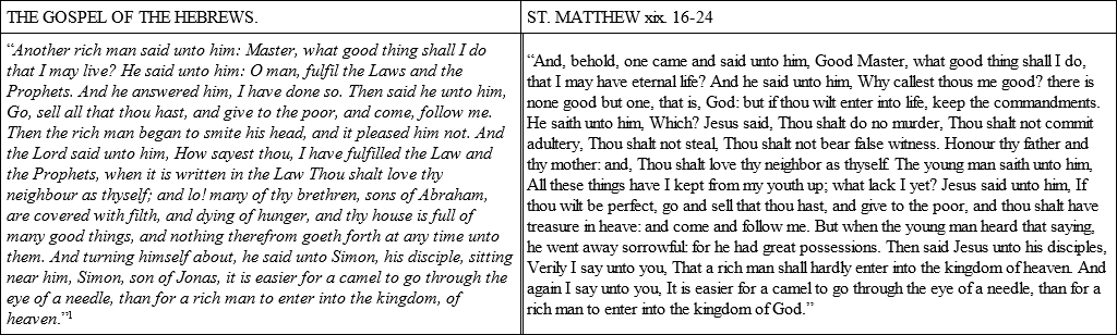 Those passages of the Gospel of the Nazarenes which most resemble passages in the Gospel of St. Matthew are not, however, identical with them; some differ only in the wording, but others by the form in which they are given.