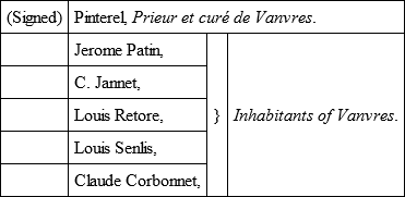 We, the undersigned, the Prieur-Curé, and the inhabitants of the parish of Vanvres, having knowledge that Marie Françoise Sommier, wife of Jacques Ferron, has possessed a jackass during the space of four years for the carrying on of their trade, do testify, that during all the while that they have been acquainted with the said ass, no one has seen any evil in him, and he has never injured any one; also, that during the six years that it belonged to another inhabitant, no complaints were ever made touching the said ass, nor was there a breath of a report of the said ass having ever done any wrong in the neighbourhood; in token whereof, we, the undersigned, have given him the present character.