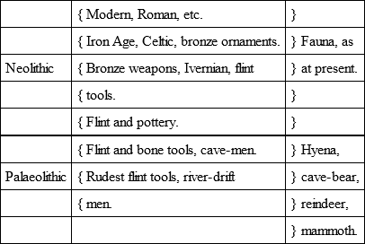 We have, in the caves of France, evidence of the successive layers of civilisation, one superposed on the other, down to the reindeer hunter, who ate horses, represented by the cave-earth man of Kent's Hole; and in this latter we have this same man superposed on the traces of the still earlier man of the river-drift. To make all plainer, I will add here a summary of the deposits.