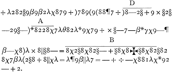 A still more remarkable instance is that of a German professor, Hermann, who boasted, in 1752, that he had discovered a cryptograph absolutely incapable of being deciphered, without the clue being given by him; and he defied all the savants and learned societies of Europe to discover the key. However, a French refugee, named Beguelin, managed after eight days’ study to read it. This cypher – though we have the rules upon which it is formed before us – is to us perfectly unintelligible. It is grounded on some changes of numbers and symbols; numbers vary, being at one time multiplied, at another added, and become so complicated that the letter e, which occurs nine times in the paragraph, is represented in eight different ways; n is used eight times, and has seven various signs. Indeed the same letter is scarcely ever represented by the same figure; but this is not all: the character which appears in the place of i takes that of n shortly after; another symbol for n stands also for t. How any man could have solved the mystery of this cypher is astonishing.