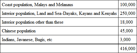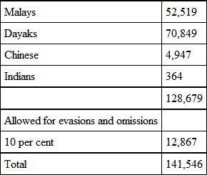 The only census that appears to have been attempted in Sarawak was taken in 1871. Judging by the report that was published in the Gazette this census was made in a very imperfect manner.39 Of the interior population it includes Sea-Dayaks, but no means were obtainable for ascertaining the numbers of Kayans, Kenyahs, and many other tribes that go to make up the population of the State. It makes no separate mention of the large coast population of the Melanaus, who were presumably lumped with the Malays.