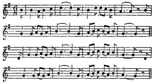 Ste. Anne d'Auray is a great pilgrimage resort, with a pretentious modern church in nondescript style intended for renaissance, 1866-75, with bad glass. In 1623 a peasant dug up an image, probably of one of the Deæ Matres of Gallo-Roman times, so common in Brittany, at a place called Ker-anna. He jumped to the conclusion that it represented the mother of the B. Virgin. The Carmelites heard of it and resolved on making capital out of it; they ran it with great success and built a convent and church on the spot in 1645. The statue was destroyed in 1790, but the cult continues unabated. The Pardon is on the Sunday after July 26, and attracts vast crowds. In front of the church is a Santa Scala copied from that at Rome, and indulgenced with nine years for every step ascended by pilgrims on their knees. A large tank receives the miraculous spring of S. Anne, and is dominated by her statue. The pilgrims sing lustily the cantique of Ste. Anne d'Auray to this air: —