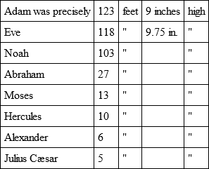There seems to be some uncertainty as to the size of our great mother. The French orientalist, Henrion, member of the Academy, however, fixed it with a precision satisfactory, at least, to himself. He gives the following table of the relative heights of several eminent historical personages: —
