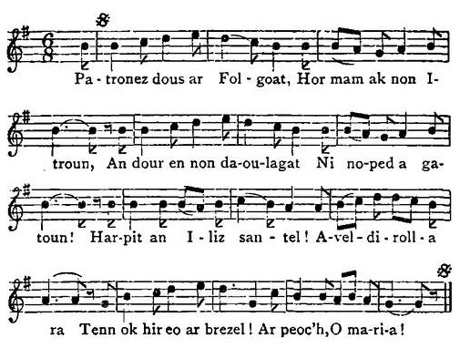 Folgoët. This famous pilgrimage church was founded in the 14th cent. when an imbecile youth died who could say no other words than Ave Maria, Salaun a zepre bara, or Salaun wants bread. A lily grew out of his grave and it was concluded accordingly that he was a saint. This was in 1358. At the west end are two towers. That on the north is admirably proportioned with spire and angle spirelets of the period, 1365, when Jean de Montfort laid the first stone. That on the S. was never finished. It is surmounted by an upper stage with Ionic pillasters added in the 17th cent. The S. side has a noble porch and transept, the E. wall of which is a continuation of that of the choir. The E. and S. transept windows are examples of the geometric style in Brittany, a rose resting on a transom. Within the stone screen is formed of three compartments, and though fine, is certainly inferior to such as are in wood. A spring wells up under the high altar and is conveyed to a Holy Well outside. La Doyenne is a picturesque building with turrets erected by Anne of Brittany, converted into Mairie and school. The P. is on the 7th and 8th September, and begins with vespers and a procession bearing candles; many beautiful costumes may be seen on this occasion.