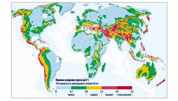 Сейсмически опасные территории на планете выделены на карте «Global Seismic Hazard Program» (2011) красными и жёлтыми цветами, менее – зелёными и голубыми.
