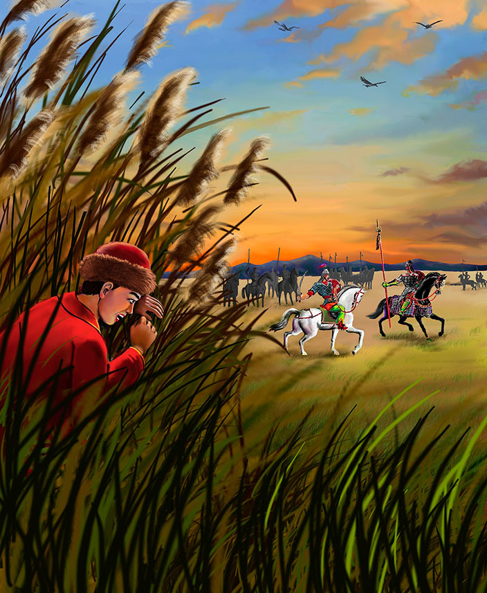 Солнце уже заходило в свое гнездо. Красный закат казался зловещим, небо давило необъяснимой жутью. Чарыш ноян, поняв, что саблей ему не одолеть противника, взял длинное копье и на полном скаку вонзил его в грудь белого тулпара. Благородное животное пошатнулось, тихо заржало и рухнуло замертво. Батыр только успел вскочить на ноги, и тут Чарыш нанес ему сокрушительный удар копьем в грудь и пробил насквозь. Огромным усилием батыр устоял на ногах, но в следующий миг потерял сознание и повис на копье.
