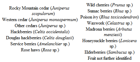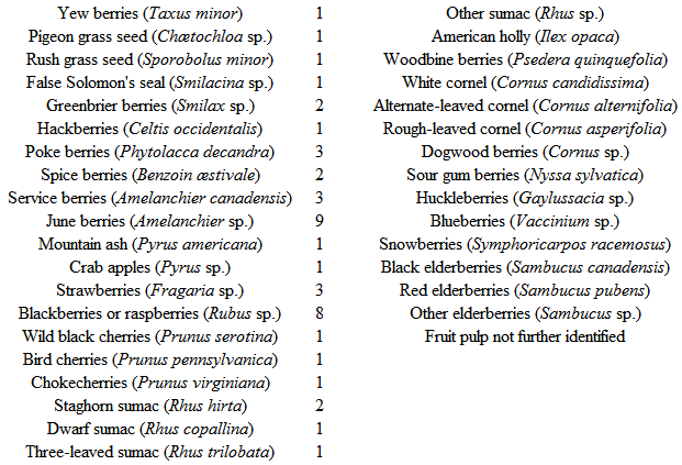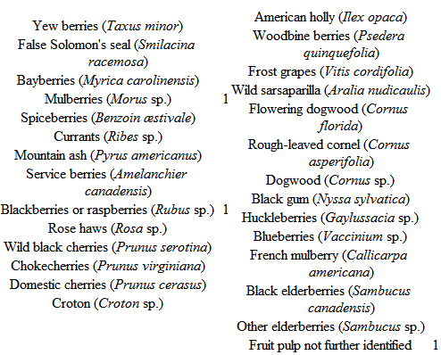 Following is a list of fruits, seeds, etc., identified and the number of stomachs in which found: