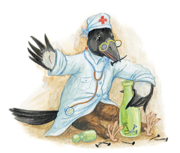 Солнце уже село. В лесу начала ухать сова. В спальне лежало много всего такого, что было бы лучше похоронить. Там повсюду валялись кроличьи кости и черепа, цыплячьи ножки и другие ужасы. Место это было страшное и очень тёмное.