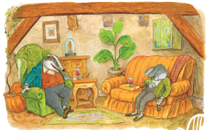 Старый мистер Прыгунок засмеялся и пригласил барсука Томми зайти в нору, чтобы попробовать кусочек кекса, испечённого из семян, и «выпить стаканчик вина из первоцвета, сделанного моей невесткой Флопси», – добавил он. Барсук Томми с готовностью протиснулся в нору.