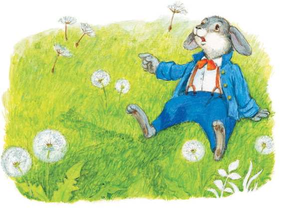 Бенджамин перебрался через вал и оказался на лугу. Там он обнаружил ещё одну ловушку на кротов. Значит, он всё ещё шёл вслед за барсуком Томми. Было уже сильно за полдень. Какие-то кролики вылезли из своих нор, чтобы насладиться вечерним воздухом. Один из них, в синей курточке, чуть в сторонке деловито охотился за одуванчиками.