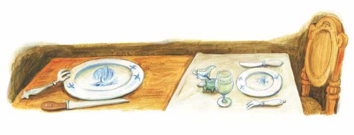 На другой стороне стола лежали частично развёрнутая скатерть, тарелка, стакан, столовые нож с вилкой, солонка и горчица. К столу был приставлен стул. Короче, всё было готово к ужину на одну персону.