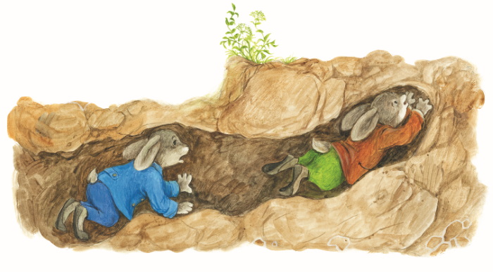 Они рыли туннель несколько часов. Из-за камней он получился не прямым. Но в конце ночи они всё-таки оказались под кухней. Бенджамин, лёжа на спине, старался пробить пол снизу. Когти Питера изрядно истёрлись. Он вышел из туннеля, стряхивая с себя песок, и тут же крикнул Бенджамину, что уже утро, всходит солнце и сойки шумят в нижнем лесу.