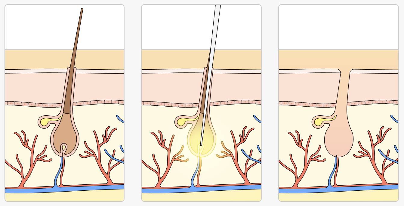 Лазерная эпиляция, воздействуя на пигмент волоса, травмирует ростковую зону, лишь примерно в 10% случаев. В результате волос вновь восстанавливается, пусть и со значительной задержкой по времени.