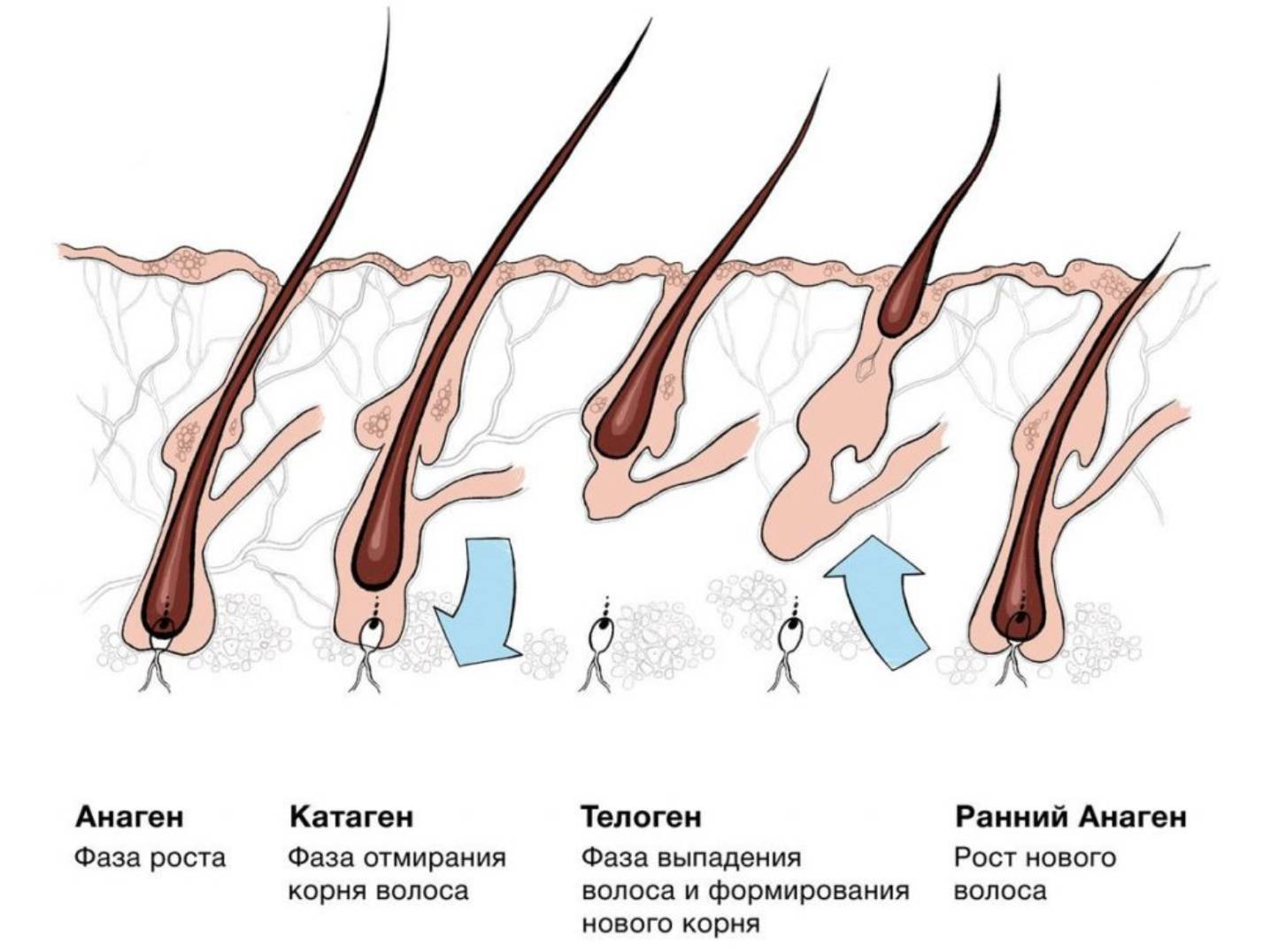 Прежде чем ответить на этот вопрос, давайте разберемся в фазах роста волос. Волосы на всем теле растут не равномерно. Они постоянно обновляются: старые выпадают, луковица отдыхает, а затем растут новые волосы. Этот процесс и называется фазами роста волос или стадиями жизни волосяного фолликула.
