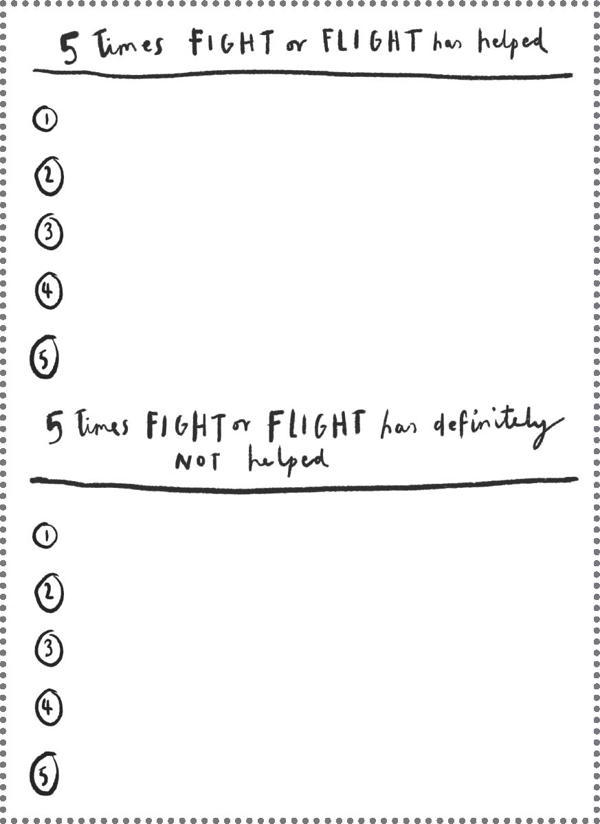 It might be helpful here to write down five times your fight-and-flight response has kicked into gear for a GOOD reason. And then write down five times it’s reared its head in an unhelpful way. We need to make an effort to distinguish the normal fear reaction from the excessive and unwarranted fear reaction so that our brains are better able to respond appropriately in a future stressful situation.