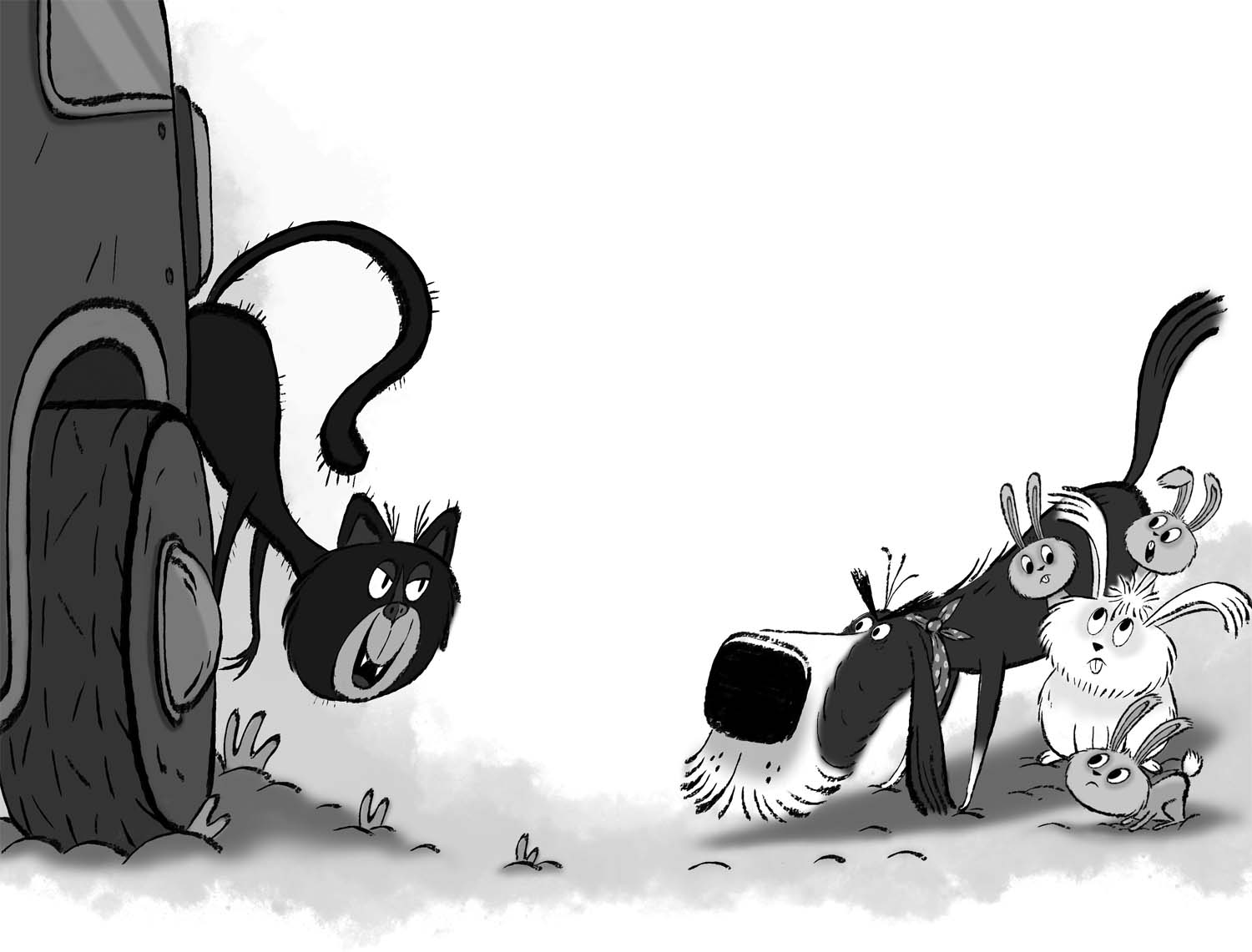 ‘How dare you ask me to help you!’ Kitty arched her back and hissed. Mr Dog stepped away and the rabbits squealed in harmony. ‘You have a nerve, you scruffy mutt.’