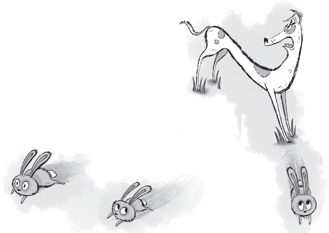 The lurcher arrived on the scene a moment later, panting for breath. ‘You fool!’ he snarled at Mr Dog. ‘You scared them all away before I could even catch one!’