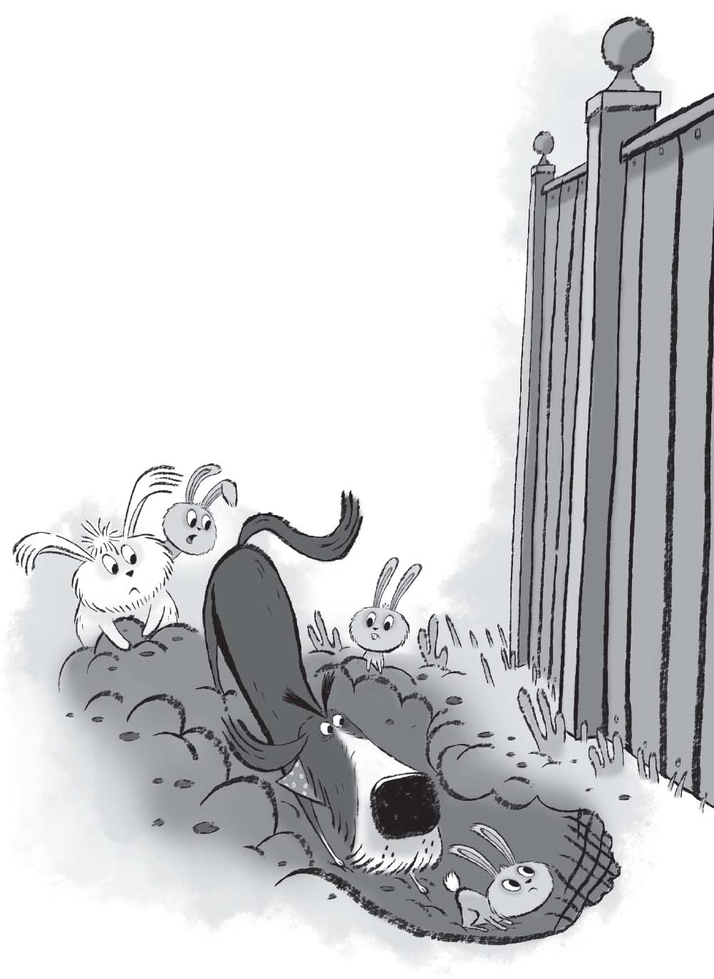 ‘Isn’t it obvious?’ Mr Dog grinned. ‘The answers – and the rabbits – lie behind the Big New Fence. Somehow we have to get inside!’