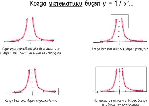 Функции х2 и 2x не слишком отличаются друг от друга для нетренированного глаза. Но, чем дольше вы изучаете математику и чем более бегло вы говорите на этом языке закорючек, тем более драматичной становится разница. Вскоре она становится нутряной, тактильной; она начинает задевать ваши чувства, и это последний жизненно важный пункт нашей стратегии. Мы должны читать строки математического текста, испытывая весь спектр эмоций – от радости и приязни до страха и трепета.