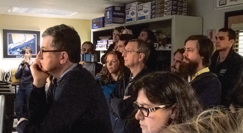 Грег Дэниелс (слева) и остальные члены команды отсматривают финальный дубль последней серии