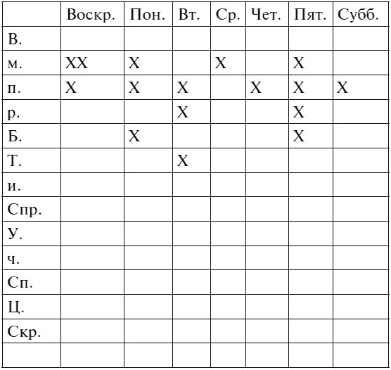 Заповедь порядка требовала, чтобы каждому делу было отведено определенное время. Поэтому одна страница моей книжечки содержала следующее расписание занятий в течение суток: