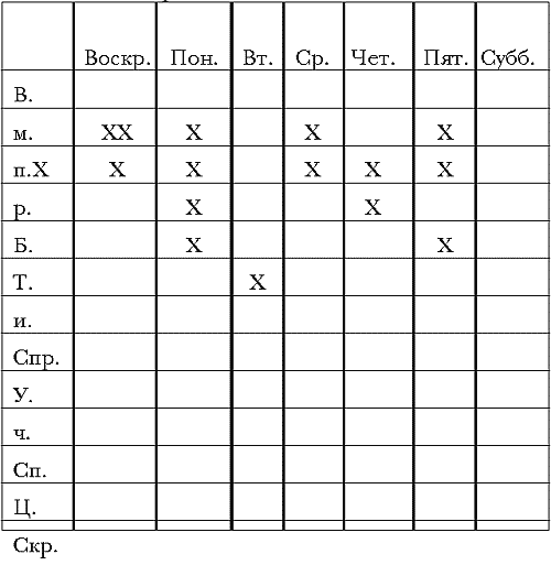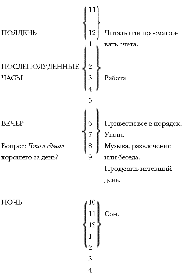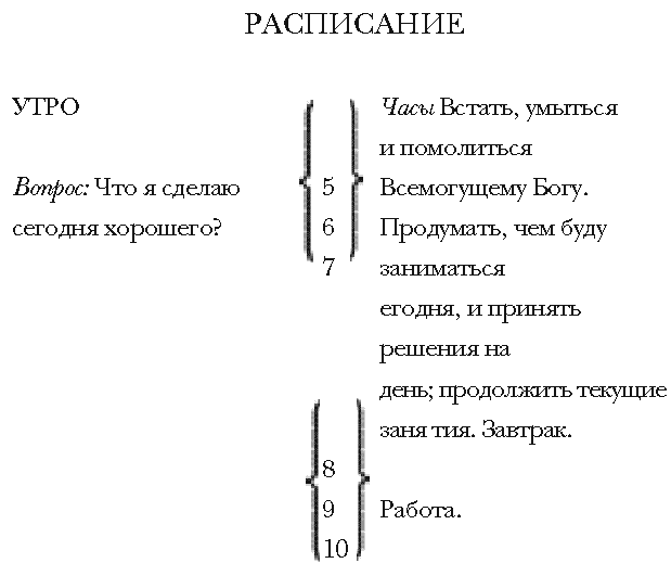 Заповедь порядка требовала, чтобы каждому делу было отведено определенное время. Поэтому одна страница моей книжечки содержала следующее расписание занятий в течение суток: