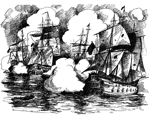 С именами этих флотоводцев, а также с мельчайшими подробностями морского сражения я познакомился много позже. Мои воспоминания, ясные и четкие в отношении всего занимательного и живописного, едва служат мне во всех тех вопросах, которые были мне тогда непонятны. Все, что я так часто слышал из уст Марсиаля, а также узнал впоследствии, позволило мне составить представление о нашей эскадре, а чтобы и вам, дорогой читатель, стала ясна обстановка перед сражением, я перечислю наши корабли, выделив те из них, которые не успели совершить маневра и тем самым образовали брешь в нашей обороне, а также укажу национальную принадлежность кораблей и схему атаки.