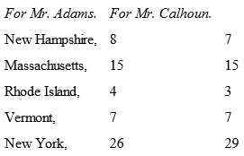 At the presidential election of 1824, the Northern States voted pretty much in a body for Mr. Calhoun, as Vice-President, giving him near the same vote which they gave Mr. Adams for President. Thus: