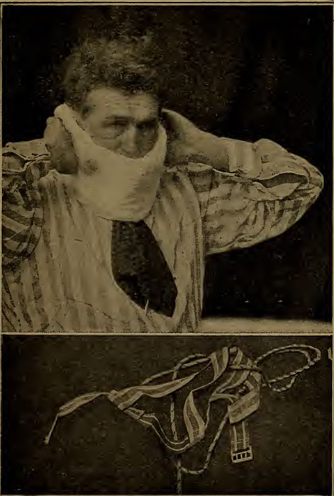 Это идеальный метод растяжки позвоночника, особенно верхней его части, с помощью изображенного на рисунке головного убора. Ноги закрепляются с помощью петли, а веревка, прикрепленная к головному убору, пропускается вокруг латунного столба у изголовья кровати. Растяжение позвоночника можно регулировать силой натяжения веревки. Не напрягайтесь. Это идеальное средство для облегчения состояния при сжатии хрящей и в значительной степени при вывихах и «подвывихов» спинных позвонков.