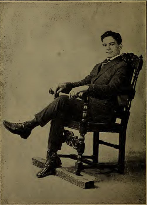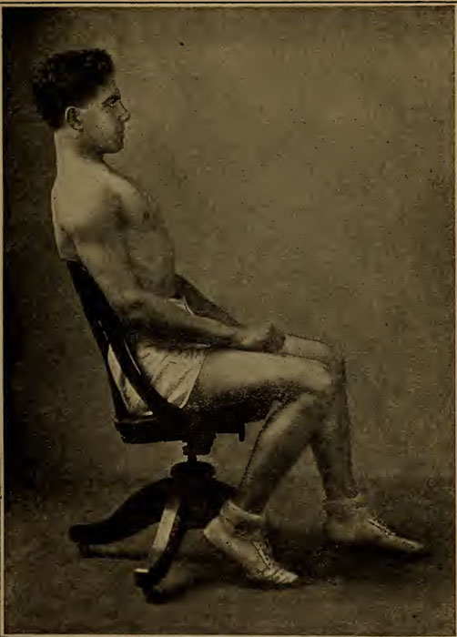 Это излюбленная американская сидячая поза, способствующая тесной груди, круглым плечам, согнутому позвоночнику, опущенным органам и общему нездоровью. В этой неправильной позе могут быть виноваты в значительной степени как наши плохо сделанные стулья, так как сам человек, который, естественно, сползает в эту позу, когда сидит на стуле такой конструкции. (См. следующее фото).