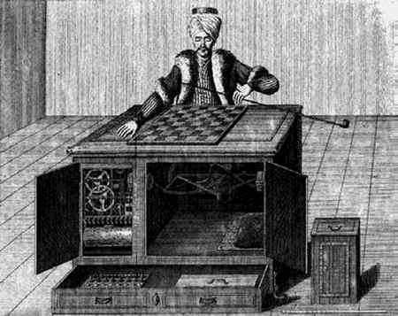 В 1770 г. венгерский механик Вольфганг фон Кемпелен представил при дворе австрийской императрицы автомат, умеющий играть в шахматы. Аппарат представлял собой большой кленовый шкаф с шахматной доской и с торсом манекена. На манекене был тюрбан, меховая шапка, густые черные усы; его левая рука сжимала трубку, правая лежала на столе, готовая играть. За тремя дверцами шкафа находилась система шестеренок, с началом игры приходивших в движение.
