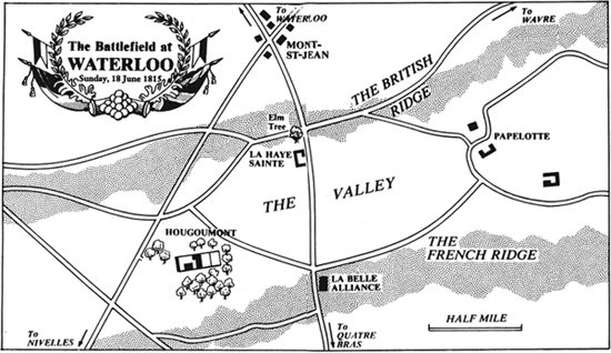 And the battle has a cliff-hanger of an ending. Waterloo was, as the Duke often admitted, a very close-run thing. ‘It was the most desperate business I was ever in,’ he wrote to his brother William after the battle. ‘I never took so much trouble about any battle, and was never so near to being beat.’ Since late morning the French had assaulted the Duke’s position, attack after attack, each one wearing the thin red line ever thinner, until at last, around 7.30 p.m. on the evening of 18 June, the Emperor launched his Imperial Guard against Wellington’s right flank. The Imperial Guard! They were the elite of Napoleon’s army, deeply experienced, proven brave, fervently loyal and protecting the reputation of being unbeatable. When in trouble Napoleon sent in the Guard and again and again they had won his battles. They were the famous ‘immortals’, and as the sun went lower across a battlefield heated by the great guns, shrouded by smoke and littered with corpses, the Imperial Guard was sent to break the Duke’s army. What happened next is one of the great passages of arms and the culmination of that most desperate business.