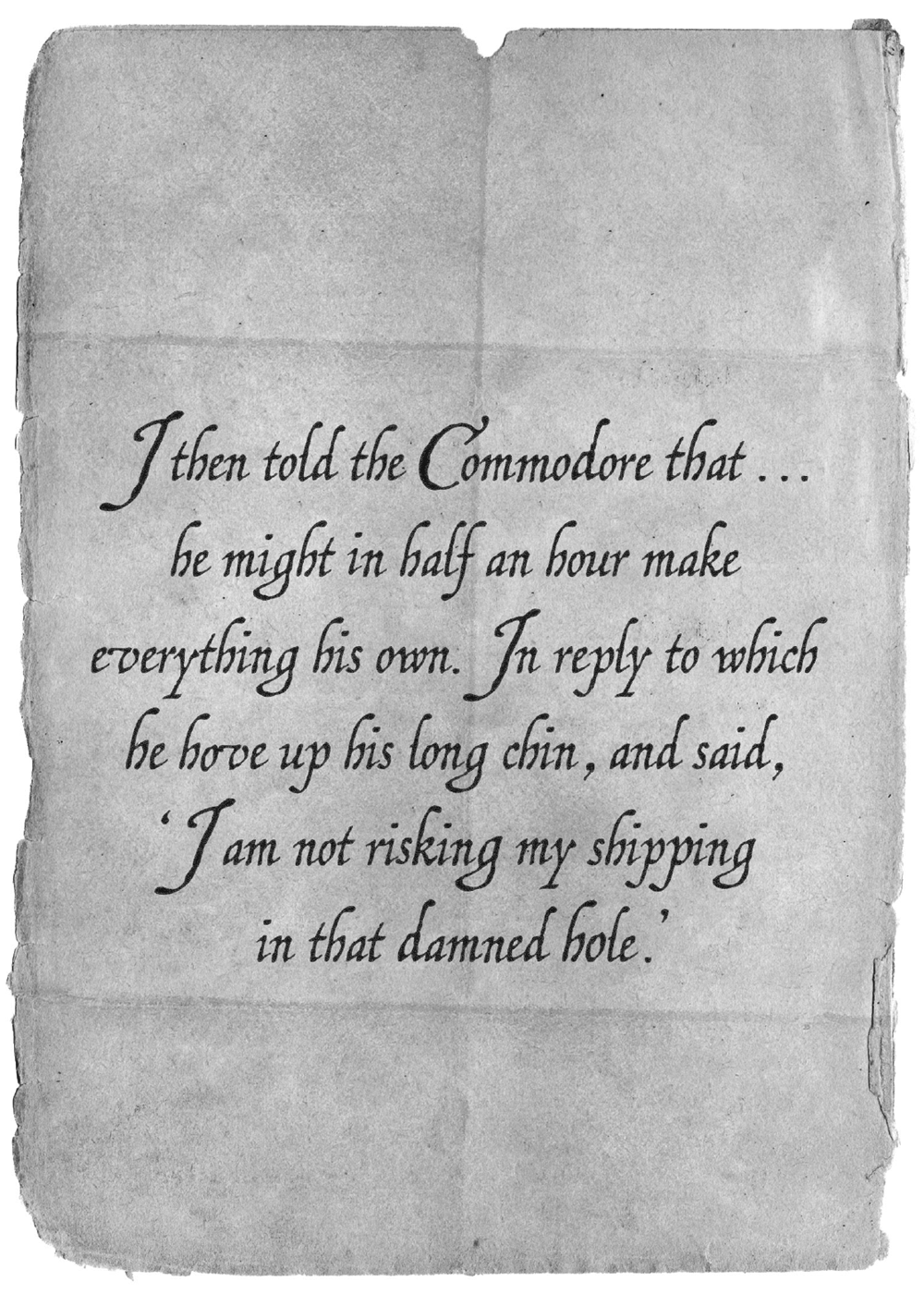 ‘Her timbers are rotten. She’s a sieve,’ Barkley said dismissively. Small waves slapped the Blonde’s hull, and the blue ensign at her stern stirred slow in the fitful wind. Still no boat appeared and so Barkley ordered the signal gun fired a second time. The sound echoed and faded again and, just when Barkley was considering taking the flotilla into the harbour without the benefit of a pilot, a seaman hailed from the foremast top. ‘Boat coming, sir!’