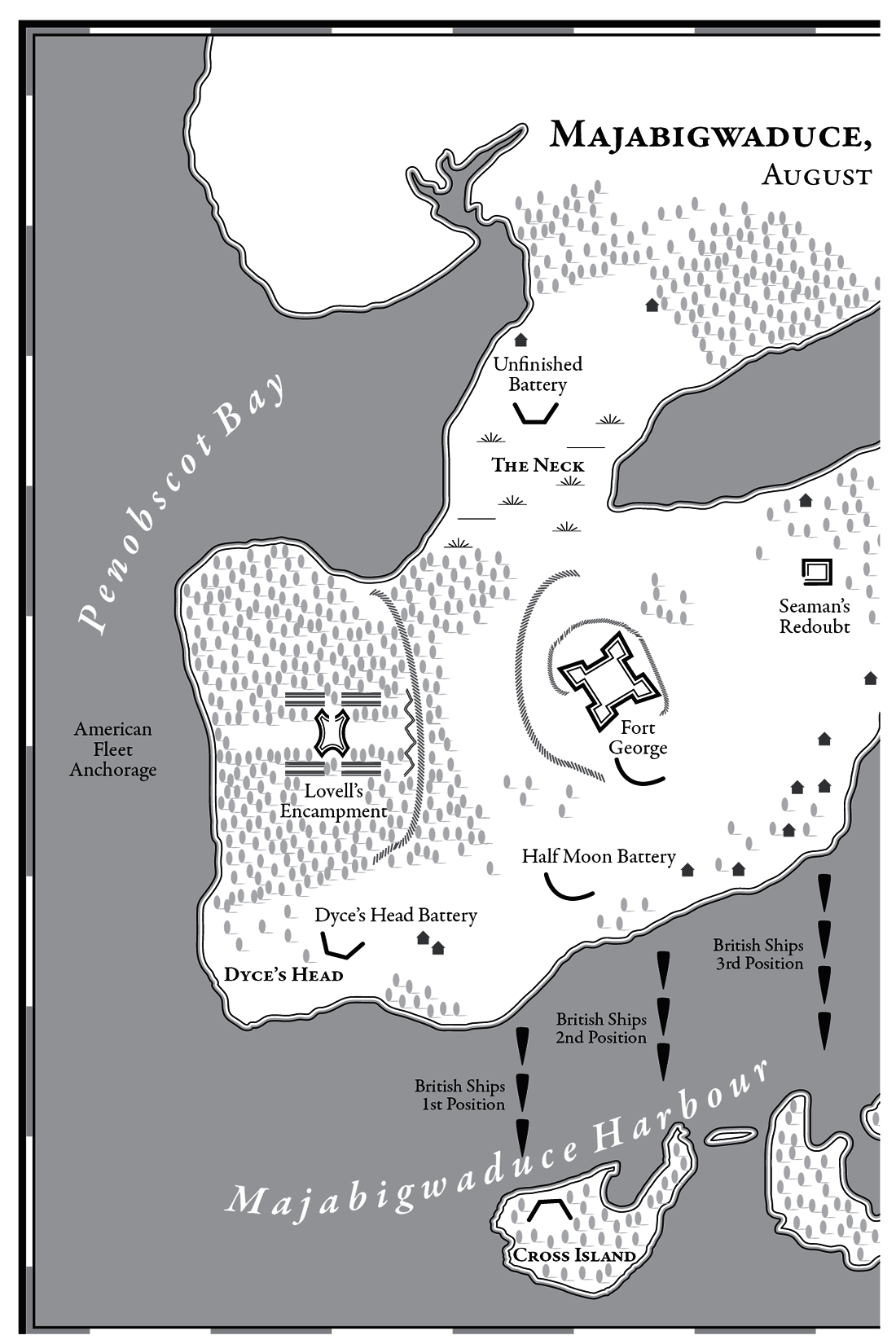 The Blonde gathered way. ‘Take her in,’ Barkley told the helmsman, and so the Blonde, the North, the Albany, the Nautilus, the Hope, and the five transports they escorted came to Majabigwaduce. They arrived safe in the harbour and anchored there. It was June 17th, 1779 and, for the first time since they had been driven from Boston in March, 1776, the British were back in Massachusetts.