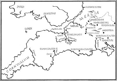 Æsc’s Hill Ashdown, Berkshire Æthelingæg Athelney, Somerset Afen River Avon, Wiltshire Andefera Andover, Wiltshire Baðum (pronounced Bathum) Bath, Avon Bebbanburg Bamburgh Castle, Northumberland Brant Brent Knoll, Somerset Bru River Brue, Somerset Cippanhamm Chippenham, Wiltshire Contwaraburg Canterbury, Kent Cornwalum Cornwall Cracgelad Cricklade, Wiltshire Cridianton Crediton, Devon Cynuit Cynuit Hillfort, nr. Cannington, Somerset Dærentmora Dartmoor, Devon Defereal Kingston Deverill, Wiltshire Defnascir Devonshire Dornwaraceaster Dorchester, Dorset Dreyndynas ‘Fort of thorns’, fictional, set in Cornwall Dunholm Durham, County Durham Dyfed South-west Wales, mostly now Pembrokeshire Dyflin Dublin, Eire Eoferwic York (also the Danish Jorvic, pronounced Yorvik) Ethandun Edington, Wiltshire Exanceaster Exeter, Devon Exanmynster Exminster, Devon Gewæsc The Wash Gifle Yeovil, Somerset Gleawecestre Gloucester, Gloucestershire Glwysing Welsh kingdom, approximately Glamorgan and Gwent Hamptonscir Hampshire Hamtun Southampton, Hampshire Lindisfarena Lindisfarne (Holy Island), Northumberland Lundene London Lundi Lundy Island, Devon Mærlebeorg Marlborough, Wiltshire Ocmundtun Okehampton, Devon Palfleot Pawlett, Somerset Pedredan River Parrett Penwith Land’s End, Cornwall Readingum Reading, Berkshire Sæfern River Severn Sceapig Isle of Sheppey, Kent Scireburnan Sherborne, Dorset Sillans The Scilly Isles Soppan Byrg Chipping Sodbury, Gloucestershire Sumorsæte Somerset Suth Seaxa Sussex (South Saxons) Tamur River Tamar Temes River Thames Thon River Tone, Somerset Thornsæta Dorset Uisc River Exe Werham Wareham, Dorset Wilig River Wylye Wiltunscir Wiltshire Winburnan Wimborne Minster, Dorset Wintanceaster Winchester, HampshirePART ONE