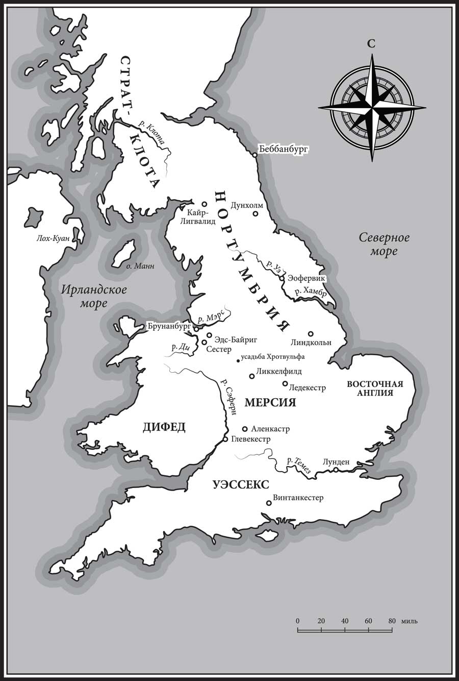 Написание географических наименований в англосаксонской Англии отличалось разночтениями, к тому же существовали разные варианты названий одних и тех же мест. Например, Лондон в различных источниках называется Лундонией, Лунденбергом, Лунденном, Лунденом, Лунденвиком, Лунденкестером и Лундресом. Без сомнения, некоторые читатели предпочтут другие варианты тех географических названий, что приведены в списке ниже, но я обычно использую написание, которое дает «Оксфордский» или «Кембриджский словарь английских географических названий» для эпохи, относящейся примерно ко времени правления Альфреда – 871–899 годам н. э., хотя и это не является непреложной истиной. К примеру, название острова Хайлинга в 956 году писалось «Хейлинсиге» или «Хаэглингейгге». Сам я тоже не был слишком последователен, используя современную форму «Нортумбрия» вместо «Нортхюмбралонд», тем самым избегая намека на то, что границы древнего королевства могли совпадать с границами современного графства.