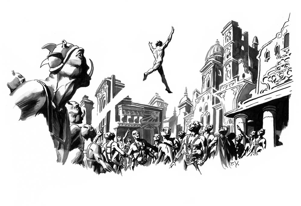 Собравшиеся воины и их вождь внимательно рассматривали меня, ощупывали мускулы и кожу. Затем главный явно выразил желание увидеть мое выступление и, жестом велев мне следовать за собой, вместе с Тарсом Таркасом направился к площади под открытым небом.