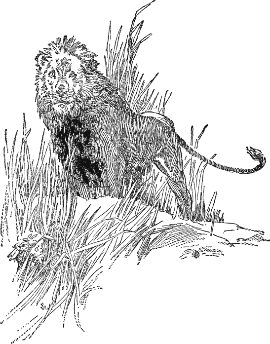 Было тихо. Клейтон ждал с поднятым копьем. Наконец еле слышный шорох кустарника подсказал ему, что зверь подкрадывается сзади и уже изготовился к прыжку. И вот молодой человек разглядел его не далее как в двадцати футах от себя: вытянутое, гибкое, мускулистое тело, темно-желтая голова и черная грива огромного льва. Зверь крался, прижавшись к земле и продвигаясь вперед очень медленно. Встретив взгляд человека, лев остановился и не торопясь подобрал под себя задние лапы. Клейтон смотрел на него в отчаянии, боясь метнуть копье и не в силах бежать.