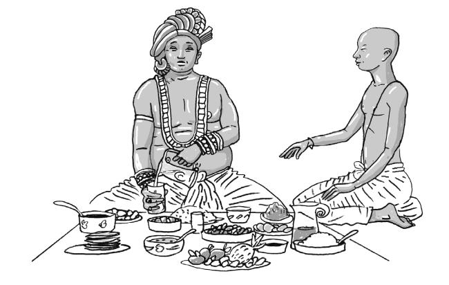В ранней проповеди (сутте) сообщается о том, что ученик Будды, местный правитель по имени Пасенади, обычно съедал очень большое количество пищи (см. 2018b, 2018e, 2019e и 2020d: 175–181). И вот, однажды, после очередного чрезмерного чревоугодия, он отправился на аудиенцию к Будде, поскольку тогда, из‑за своего переедания, он вдруг стал задыхаться. Будда, заметив это его состояние, изрек строфу о необходимости постоянной внимательности для того, чтобы знать меру в принятии пищи, что, в свою очередь, приводит к увеличению продолжительность жизни.