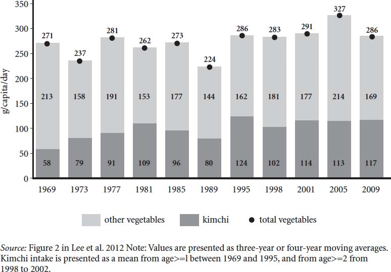Vegetable consumption in Republic of Korea, 1969–2009, grams per person per day.