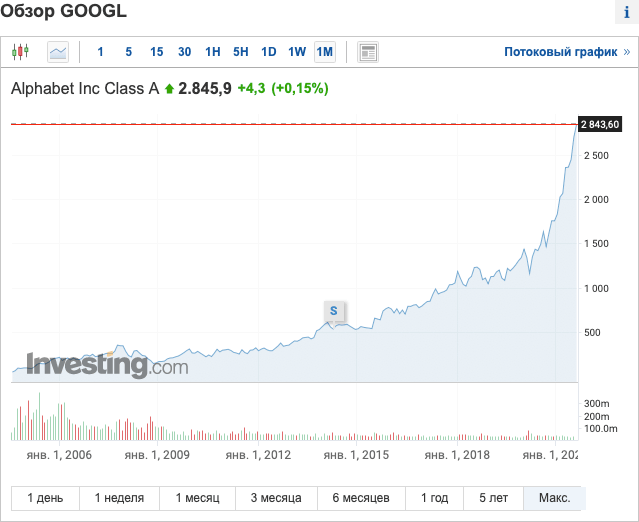 Ведь и десять лет назад было понятно, что это поисковик № 1 в мире, и все будет только расти. Правда, стоимость компании тогда была в десять раз ниже $ 250. Если почитаете аналитические статьи, то в перспективе 3–5 лет GOOGLE может преодолеть порог в 5 тыс. за одну акцию.