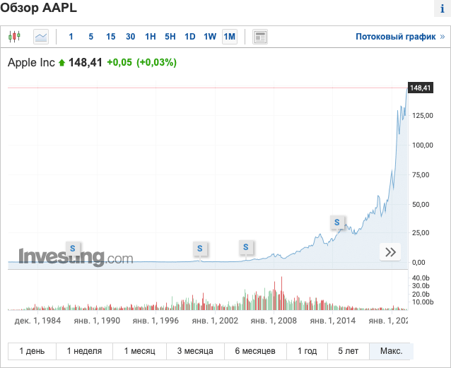 В тот момент, когда вышел iPhone 4, а потом и 5-го поколения, было уже понятно, что мир захватит «яблоко», и это только вопрос времени. Продукт был уже крутым, а акции торговались в вилке $ 10–15. Сейчас они на пике стоимости – почти $ 150. Будет ли рост дальше? Однозначно это не предел, и с развитием своей экосистемы акции компании будут только расти.